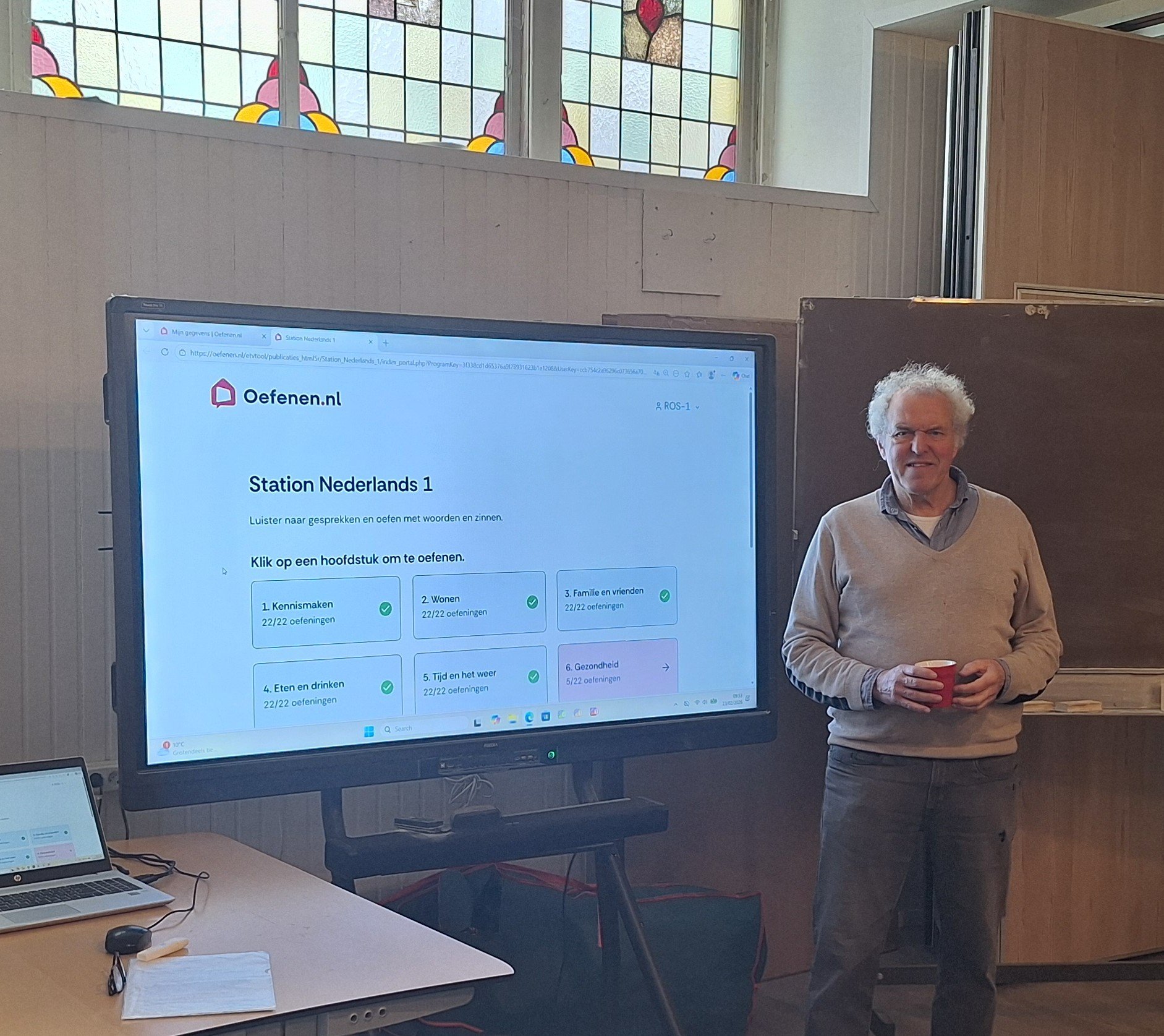 “Al weer negen jaar! Voor mijn gevoel ben ik net begonnen. Elke maandagochtend geef ik les aan een beginnersgroep van zo’n vijftien tot twintig mensen. Onderling zijn de verschillen groot in niveau, ambitie, leeftijd en snelheid van oppikken. Sommige mensen kunnen niet eens in hun eigen taal lezen en schrijven, laat staan een vreemde taal. We proberen de taal op een natuurlijke manier te leren aan de hand van verschillende thema’s, zoals eten en drinken, wonen of gezondheidszorg. Al doende leren ze beetje bij beetje de taal begrijpen en spreken. Ik was wel geraakt door één van de cursisten die zei tijdens een voorstelrondje: ‘Ik heb weinig vrienden. Mijn vrienden zitten hier.’ Het sociale aspect is dus ook heel belangrijk. Je ontmoet andere mensen. Er is koffie met een koekje en het is hier lekker warm.