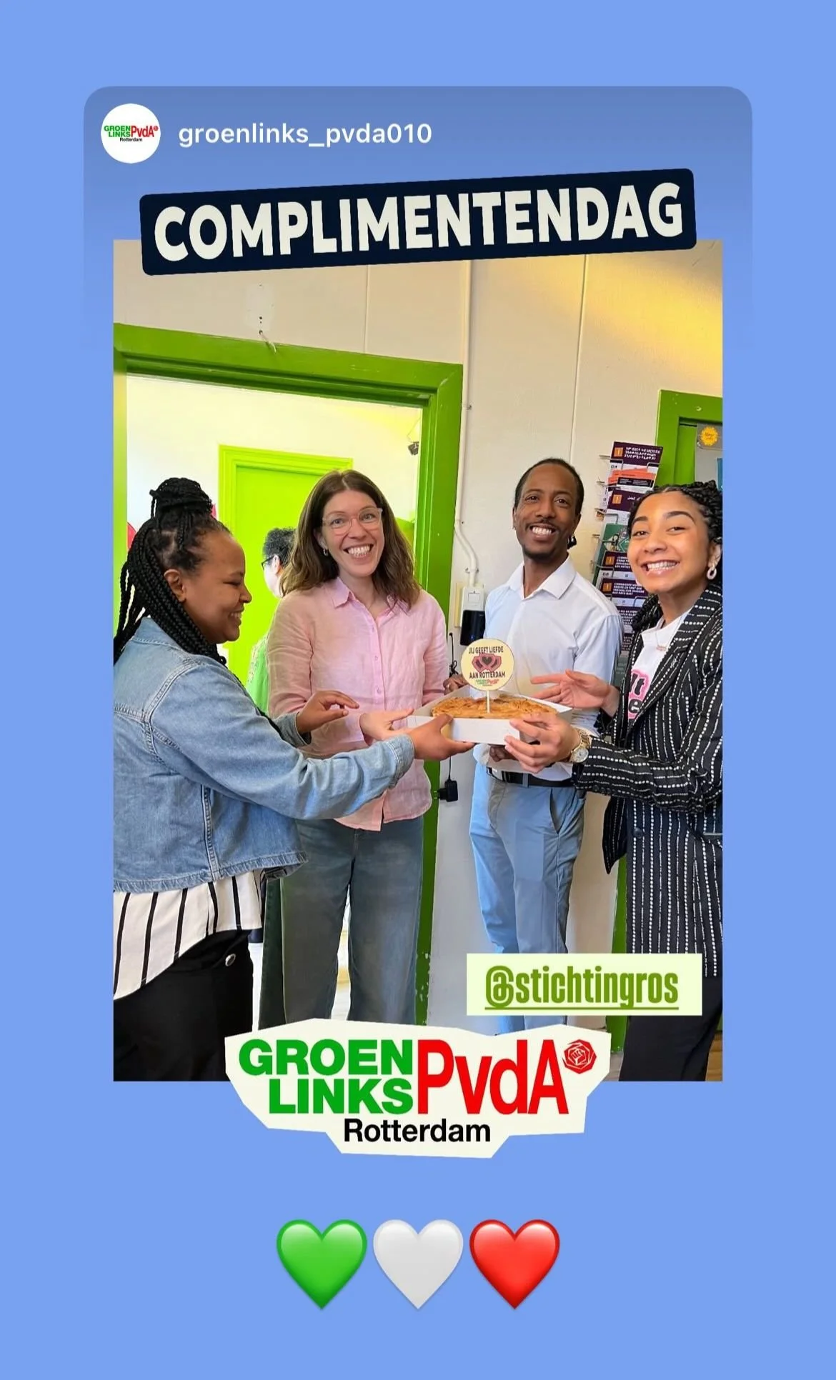 Op internationale complimentendag kwam GroenLinks-PvdA langs bij ROS met een mooie complimententaart als dank voor het harde en liefdevolle werk!