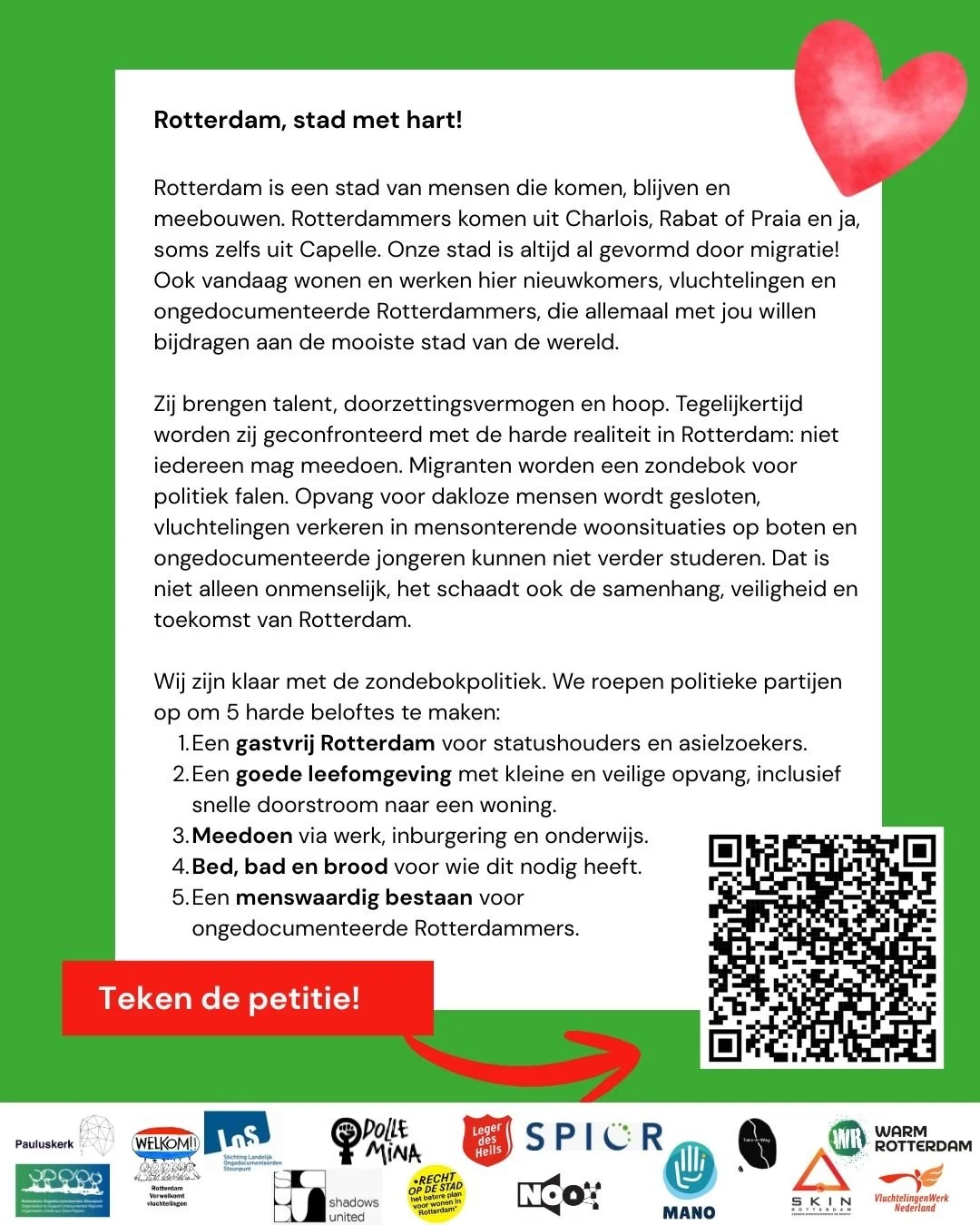 Een brede coalitie van Rotterdamse maatschappelijke en religieuze organisaties lanceert de campagne ‘Rotterdam, Stad met Hart’. Met een publiekscampagne, een petitie en een stemoproep richting 18 maart roepen zij politieke partijen op zich te verbinden aan een menswaardig, liefdevol en gastvrij Rotterdam voor álle Rotterdammers.